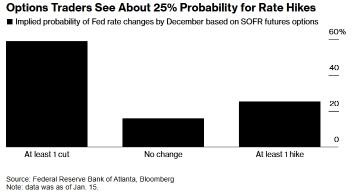 Опционные трейдеры видят вероятность повышения ставок около 25%. Источник: Федеральный резервный банк Атланты, Bloomberg. Примечание: данные по состоянию на 15 января.