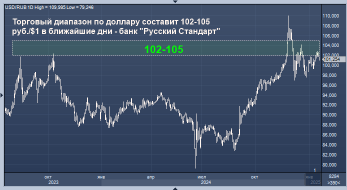 Торговый диапазон по паре рубль/доллар, скорее всего, составит в ближайшие дни 102-105 руб./$1, по паре рубль/евро - 105-108 руб./EUR1, полагает директор департамента операций на финансовых рынках банка "Русский Стандарт" Максим Тимошенко.