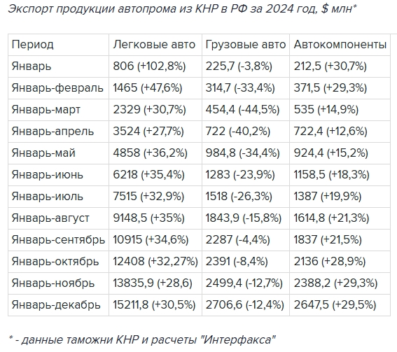 В 2024 году Китай увеличил экспорт легковых автомобилей в Россию на 30,5%. По данным «Интерфакса», основанным на информации Главного таможенного управления КНР, объём экспорта достиг рекордных 15,2 миллиарда долларов.