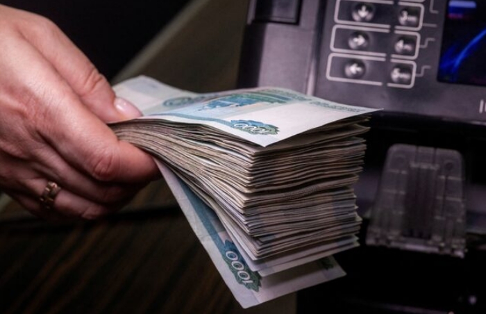 Сотрудник держит российские 1000-рублевые купюры рядом с аппаратом для подсчета денег в отделении банка в Москве, Россия, на этой иллюстрации, сделанной 9 октября 2023 года. REUTERS/Максим Шеметов