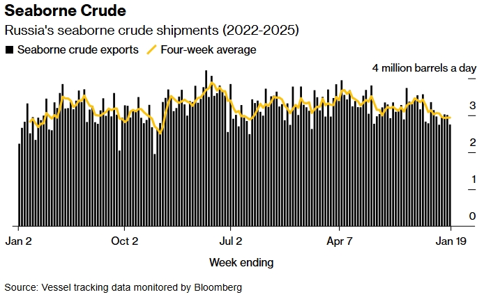 Согласно данным отслеживания судов и отчётам портовых агентов, за неделю до 19 января в общей сложности 26 танкеров погрузили 19,26 млн баррелей российской сырой нефти. Это на 3% меньше, чем на предыдущей неделе.