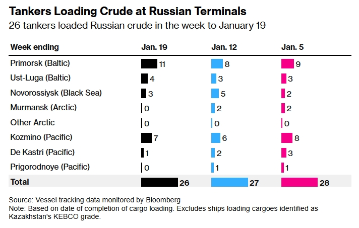 За неделю по 19 января российскую нефть погрузили на 26 танкеров. Источник: данные отслеживания судов, отслеживаемые Bloomberg. Примечание: На основе даты завершения погрузки груза. За исключением судов, загружающих грузы, идентифицированные как класс KEBCO Казахстана.