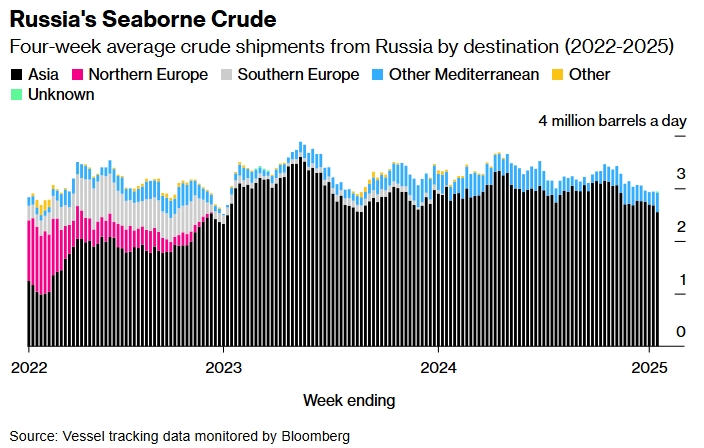 Морские поставки сырой нефти из России (2022-2025 гг.). Источник: данные отслеживания судов, отслеживаемые Bloomberg.