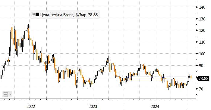 График нефти марки Brent интервалом в 1 неделю. Черная горизонтальная линия - $79.9 за баррель - средняя цена Brent в 2024 году.