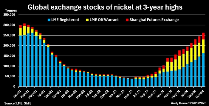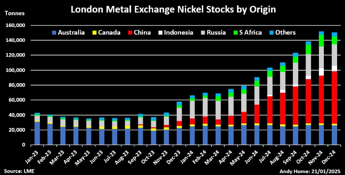 В системе хранения LME не было китайского никеля до августа 2023 года. По состоянию на конец декабря 2024 года их было 70 000 тонн, что составляет 47% от запасов. Первый индонезийский металл появился в июле прошлого года и к концу декабря объем составил более 7 000 тонн.