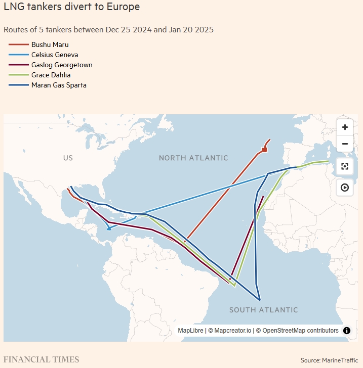 В Атлантическом океане танкеры, перевозящие сжиженный природный газ (СПГ), меняют свой курс и направляются в Европу. Это происходит из-за того, что владельцы грузов хотят извлечь выгоду из ситуации на рынке, где прекратились поставки российского трубопроводного газа через Украину.