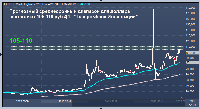 Среднесрочный вероятный диапазон для пары рубль/доллар составляет 105-110 руб./$1, говорится в комментарии аналитиков сервиса "Газпромбанк Инвестиции".