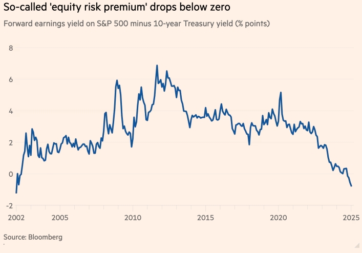Распродажа казначейских облигаций привела к росту доходности 10-летних облигаций до 4,65%. Это означает, что разница между доходностью акций и облигаций, которая ранее считалась мерой риска акций, стала отрицательной и достигла уровня, который в последний раз наблюдался в 2002 году во время бума и краха доткомов.