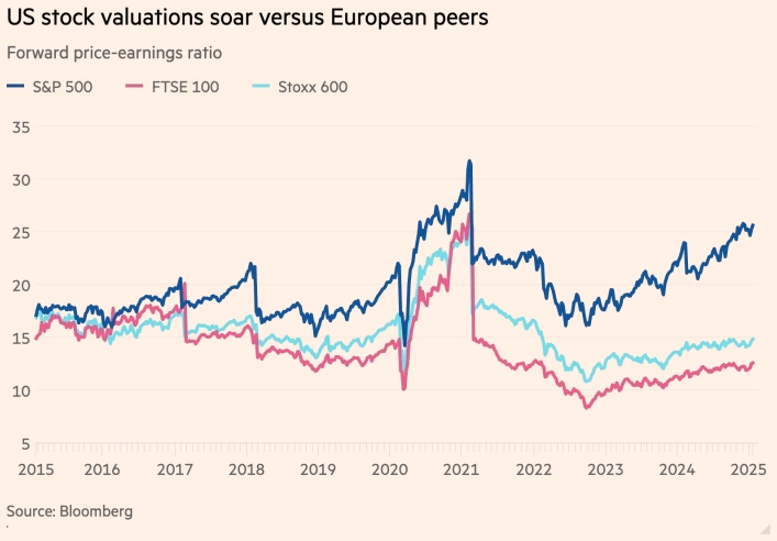 «Здесь есть несколько красных флажков, которые должны заставить нас быть немного осторожнее», — сказал Крис Джеффери, глава макроэкономики в отделе управления активами Legal & General. «Самым неприятным является разница между тем, как оцениваются американские и неамериканские акции».