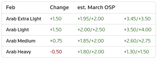 По данным источников в азиатской нефтеперерабатывающей отрасли, официальная цена продажи (OSP) флагманской нефти Arab Light в марте может вырасти на 2–2,5 доллара за баррель по сравнению с февралём. Один из источников ожидает рост на 3 доллара за баррель по всем сортам.