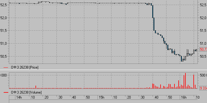 Днем понедельника цена облигаций ОФЗ-26238 (фиксированный купон) рухнули почти на 5% всего за двадцать минут. Поводом для этого послужило сообщение о том, что Минфин РФ зарегистрировал семь дополнительных выпусков облигаций федерального займа с постоянным купонным доходом объемом до 50 млрд руб. каждый, включая ОФЗ-26238.