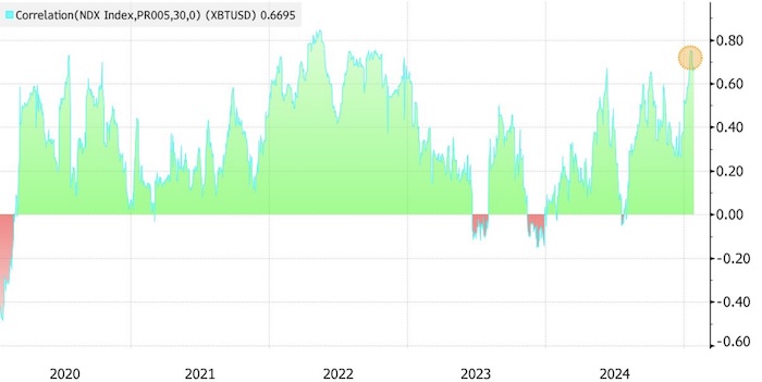 Тесная корреляция биткоина с акциями технологических компаний США подчеркивает его уязвимость. По данным Bloomberg, 30-дневный коэффициент корреляции между криптовалютой и индексом Nasdaq 100 составляет около 0,67. Значение 1 указывает на синхронное движение активов, а минус 1 — на обратную зависимость.