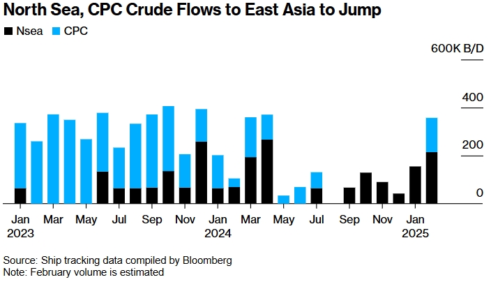 Северное море, потоки сырой нефти КТК в Восточную Азию резко возрастут. Источник: данные отслеживания судов, собранные Bloomberg. Примечание: объем за февраль указан приблизительно.