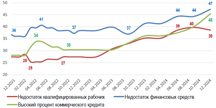 Во-вторых, согласно опросам РСПП, в III кв. 2024 г. доля компаний, столкнувшихся с неплатежами со стороны контрагентов, подскочила до 37% с 20–22% в среднем за 2021—2023 гг. Эксперты ЦМАКП предполагают, что данный факт объясняется тем, что компании перенаправляют денежные средства из производственного оборота в более доходные срочные депозиты и ОФЗ. В результате растет их кредиторская задолженность перед поставщиками.