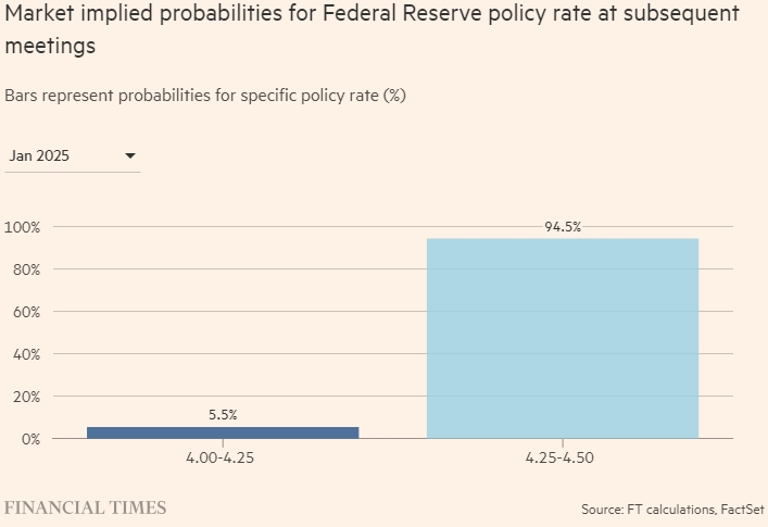Подразумеваемые рынком вероятности изменения процентной ставки Федеральной резервной системы в предстоящие заседания. Столбцы представляют собой вероятности для определенной процентной ставки (%). FT. Источник: расчеты FT, FactSet