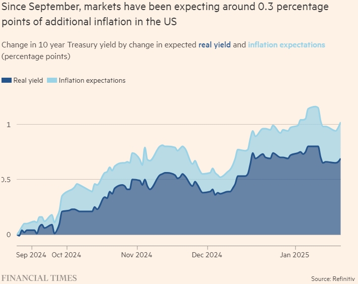 С сентября рынки ожидали около 0,3 процентных пункта дополнительной инфляции в США. Изменение доходности 10-летних казначейских облигаций за счет изменения ожидаемой реальной доходности и инфляционных ожиданий (в процентных пунктах). Реальная доходность. Инфляционные ожидания. FT. Источник: Revinitiv