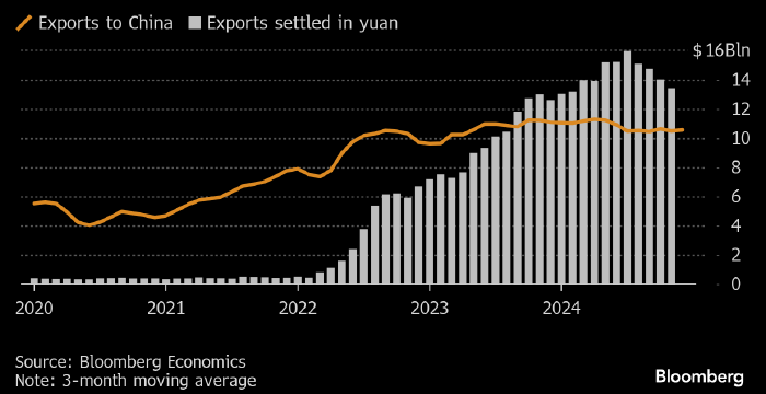 Оранжевым: экспорт из России в Китай, серым — экспорт из России, оплачиваемый юанями (в эквиваленте млрд USD). Источник: Bloomberg