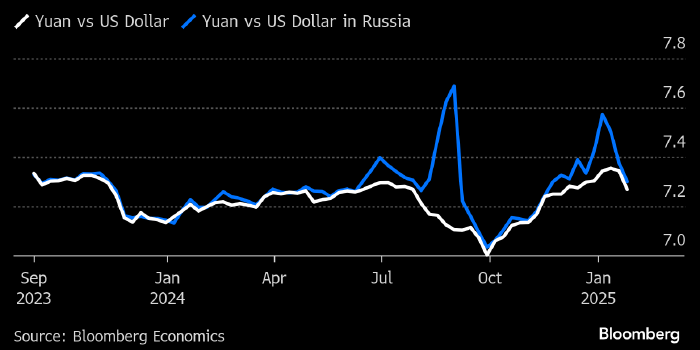 Рубль укрепился по отношению к юаню примерно на 10% с минимума, зафиксированного в конце ноября. Одновременно с этим спред между курсами юаня к доллару на российском рынке и за рубежом вновь сократился в январе, что свидетельствует об улучшении доступа российских компаний к расчетам в юанях, отмечает Bloomberg Economics.