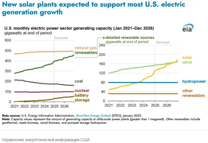 В США возобновляемые источники энергии становятся всё более популярными. В 2024 году ветер и солнце впервые опередили уголь в структуре электроэнергетики. В своём отчёте EIA прогнозирует рост мощности ветроэнергетики в этот период.