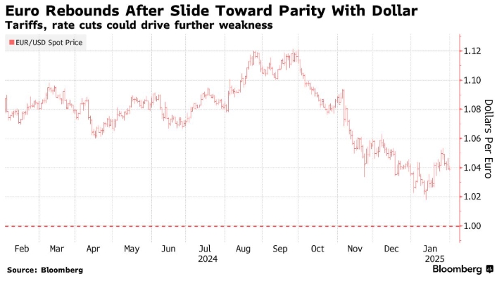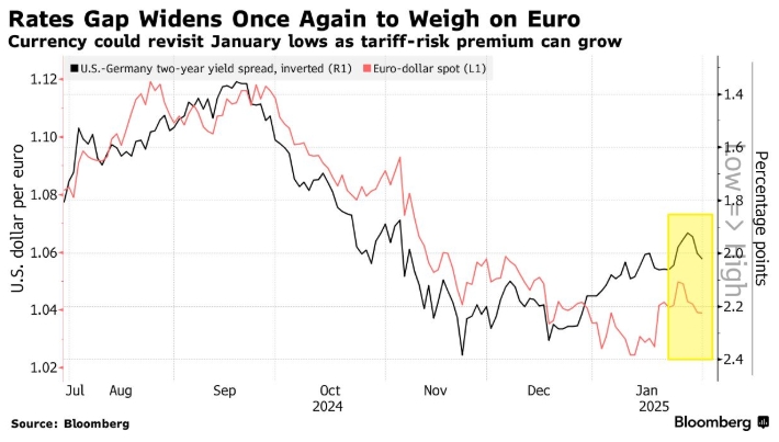 После падения до двухлетнего минимума в начале этого месяца до 1,0178 евро восстановился на фоне облегчения, вызванного тем, что Трамп не ввёл тарифы для Европы в первые дни своего президентства. В пятницу валюта торговалась около 1,04 доллара, а государственные облигации удерживали рост, достигнутый после решения по ставке в четверг. Двухлетняя доходность торговалась на уровне 2,18% после падения на 10 базисных пунктов в четверг, что стало самым значительным падением с 22 ноября.