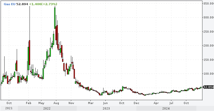 В пятницу, 31 января, ближний контракт на индекс газа голландской биржи TTF торговался чуть выше 52 евро/МВт-ч — это самый высокий показатель с конца 2023 года, но все еще намного ниже цен во время энергетического кризиса 2022 года.