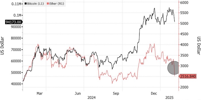 К середине утра в Сингапуре Ethereum торговался вблизи $2 500, биткоин — на уровне $93 900, а связанный с Ripple XRP упал более чем на 15% до $2.20.