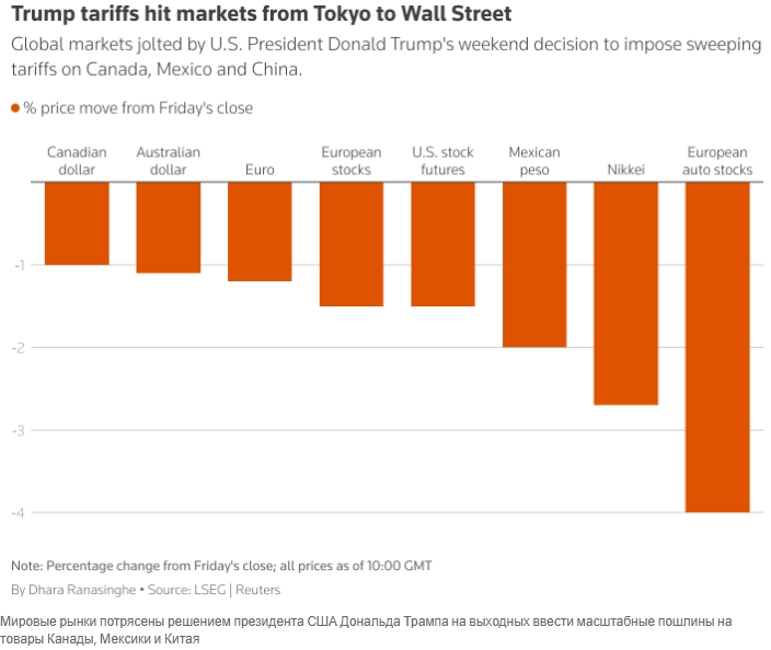 В выходные президент США объявил о введении дополнительных пошлин в размере 25% на импорт из Мексики и большинство товаров из Канады, а также 10% на товары из Китая. Это решение вызвало потрясение на рынках, которые ранее считали, что Трамп в основном блефует и просто хвастается.