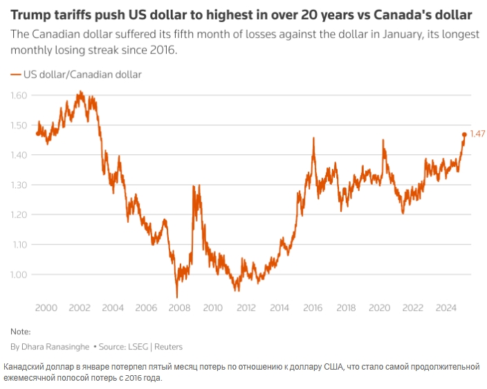 Канадский доллар, который в конце января зафиксировал самую длительную месячную серию потерь с 2016 года, упал ещё сильнее, достигнув самого низкого уровня за последние 20 лет и составив почти 1,48 по отношению к доллару США.