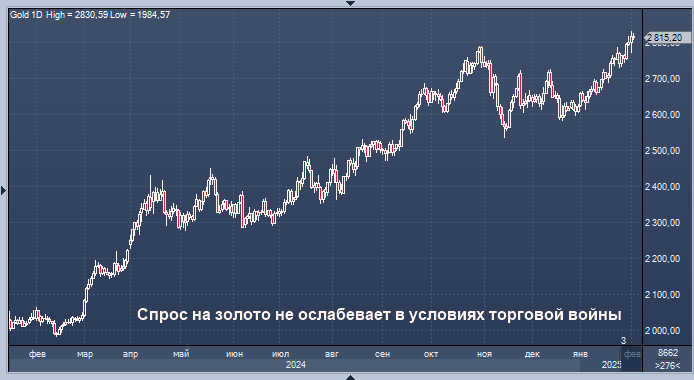 По состоянию на 08:13 по Гринвичу спотовая цена на золото составляла 2811,59 доллара за унцию, не изменившись по сравнению с предыдущим днём. Однако в понедельник золото достигло рекордного максимума в 2830,49 доллара.