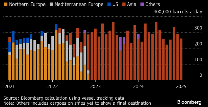 Куда отправляется российская нефть из Мурманска (в тыс. б/д): желтым — Северная Европа, серым — Средиземноморская Европа, голубым — США, коричневым — Азия, фиолетовым — другие направления. Источник: Bloomberg