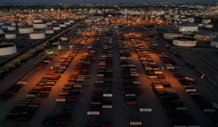 В марте 2022 года в Карсоне, штат Калифорния, США, на складе, который находится в окружении нефтехранилищ и нефтеперерабатывающих предприятий, были запечатлены грузовые контейнеры. Снимок сделан с помощью беспилотного летательного аппарата. Автор фотографии — агентство Reuters, автор фото — Бинг Гуан.