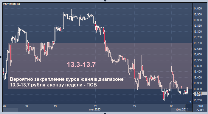 До конца недели эксперт банка по-прежнему прогнозирует закрепление курса в диапазоне 13,3-13,7 рублей за юань и допускает движение к верхней границе указанного диапазона.