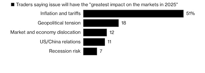 В 2025 году на больше всего на рынки будут влиять инфляция и тарифы, за ними последуют геополитическая напряженность. Такие результаты показал ежегодный опрос трейдеров JPMorgan. Около 41% респондентов отметили волатильность как главную проблему в торговле, в прошлом году на нее жаловались 28%.