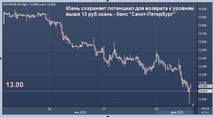Юань сохраняет потенциал для возврата к уровням выше 13 руб./юань, говорится в обзоре банка "Санкт-Петербург".