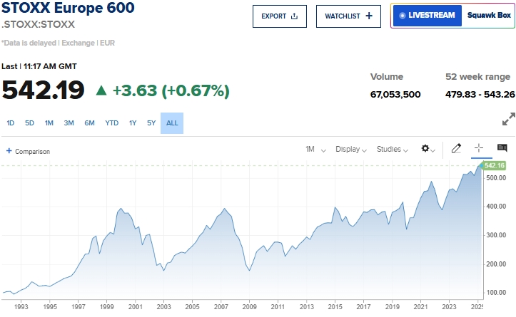 Общеевропейский индекс STOXX 600 (см. график STOXX 50) вырос на 0,7% по состоянию на 09:30 по Гринвичу. Последний раз базовый индекс достигал максимальных значений за всю историю 31 января 2019 года.