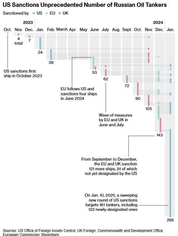 10 января Министерство финансов США ввело санкции против 161 нефтяного танкера, которые участвовали в перевозке российской нефти. Это стало частью мер, направленных против России, которые были приняты уходящей администрацией Байдена и ещё не были смягчены президентом Дональдом Трампом. Есть вероятность, что он может пойти ещё дальше в преддверии мирных переговоров по Украине.