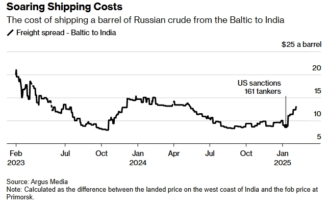 Это не такие высокие цены, как были в первые недели после введения ценового предела, когда стоимость транспортировки из Балтийского моря в Индию превышала 20 долларов за баррель. Однако с 10 января цена выросла на 4,20 доллара за баррель, или на 48%.