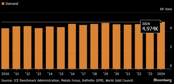 Цены на золото выросли на 27% за год, поскольку инвесторы увеличили аппетит к безопасным активам на фоне конфликтов на Украине и Ближнем Востоке, а центральные банки начали снижать процентные ставки. Согласно отчету, общий спрос на золото в прошлом году вырос на 1% до годового рекорда в 4 974 тонны.