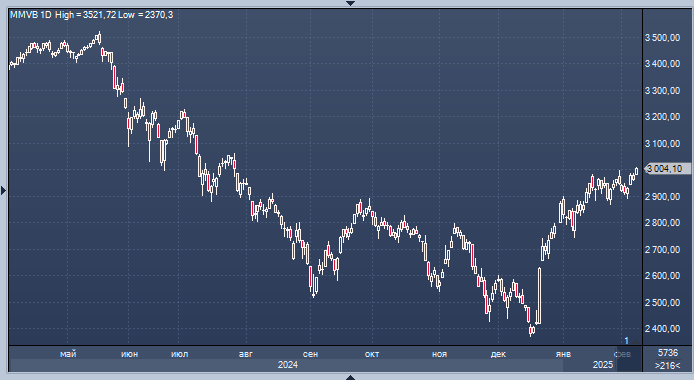 По состоянию на 14:41 по московскому времени индекс МосБиржи составил 3002,34 пункта, что является максимальным значением с 26 июля 2024 года. Индекс РТС составил 972,29 пункта.