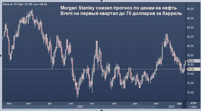 Morgan также снизил свой прогноз по ценам на нефть марки Brent на первый квартал на 2,5 доллара до 75 долларов за баррель. Банк отметил, что с 2007 года наиболее распространённая цена Brent с учётом инфляции в долларах 2025 года составляла 77 долларов за баррель. На момент закрытия торгов в США в понедельник цена на Brent составила 75,87 доллара за баррель, что в среднем соответствует уровню 77,69 доллара за баррель за весь год.