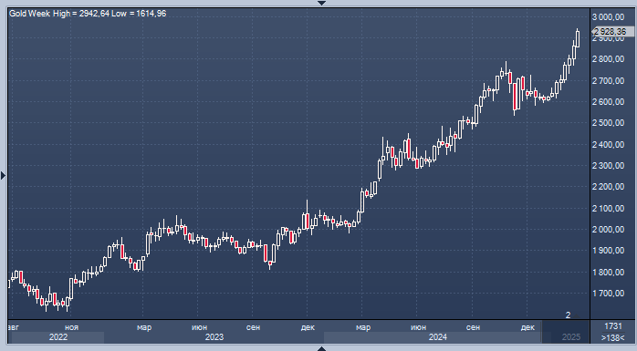 Спотовое золото выросло на 0,3% и достигло отметки в $2936,99 за унцию к 11:04 по Гринвичу. Это увеличило недельный рост до 2,6%. Во вторник цена достигла рекордного максимума в $2942,70.