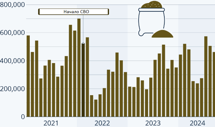 Данные Евростата показывают, что в 2023 году в ЕС было импортировано около 3,9 млн тонн российских удобрений, а за первые девять месяцев 2024 года — 3,7 млн тонн. В июле 2024 года цифра составила 574 тыс. тонн, превысив на 50% аналогичный показатель 2021 года.