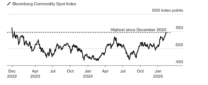 Нарастающие глобальные торговые конфликты усиливает ценовое давление и нарушают цепочки поставок, толкая цены ключевого сырьевого индекса к двухлетнему максимуму. Спотовый индекс сырьевых товаров Bloomberg — корзина сырья, включающая металлы, энергоносители и сельхозпродукцию — вырос почти на 8% в этом году, достигнув самого высокого уровня с декабря 2022 года.
