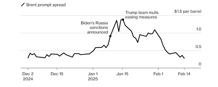 Потоки российской нефти снова оказались в центре внимания нефтяного рынка. Переговоры о санкциях и конфликте на Украине могут повлиять на цены в ближайшие недели. Спред на ближайшие поставки нефти Brent — который расширяется при ожидаемом дефиците ближайших поставок и сужается при их достаточности — резко вырос в прошлом месяце, когда покупатели искали замену российской нефти после жестких новых ограничений от уходящей администрации Байдена. С тех пор показатель снизился благодаря росту альтернативных поставок и возможности мирных переговоров по Украине.