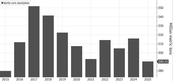 Продолжительная засуха в Аргентине и частях Бразилии вынудила Министерство сельского хозяйства США снизить прогноз мировых запасов кукурузы в условиях устойчивой продовольственной инфляции. Ведомство оценивает резервы в 290,3 млн метрических тонн, что является четырехлетним минимумом, а базовые фьючерсы в Чикаго торгуются около самых высоких уровней с августа 2023 года.