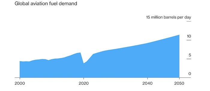 Несмотря на стремление к нулевым выбросам, прогнозируется рост мирового спроса на авиационное топливо до более чем 11 млн галлонов в день к середине века, согласно данным BloombergNEF и Международного энергетического агентства. Это включает смесь авиационного керосина, авиационного бензина и экологически чистого авиационного топлива. Более 40 авиакомпаний поставили цели достичь нулевых выбросов в авиации к 2050 году, но по мнению BNEF, это не будет достигнуто без «значительного политического вмешательства» в сочетании с технологическими достижениями.