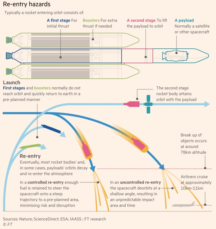 Опасности повторного входа. Обычно ракета, выходящая на орбиту, состоит из: первая ступень для начальной тяги, усилители для дополнительной тяги при необходимости, вторая ступень для вывода полезной нагрузки на орбиту. Полезная нагрузка: обычно спутник или другой космический аппарат. Первые ступени и ускорители обычно не выходят на орбиту и быстро возвращаются на Землю по заранее запланированному плану. Корпус ракеты второй ступени выходит на орбиту с полезной нагрузкой. Разрушение объектов происходит на высоте около 78 км. Повторный вход. В конце концов, большинство корпусов ракет, а в некоторых случаях и полезных грузов, сходят с орбиты и снова входят в атмосферу. При управляемом возвращении в атмосферу сохраняется достаточно топлива, чтобы направить космический корабль по крутой траектории в заранее запланированную область, сводя к минимуму риск и сбои. При неконтролируемом возвращении в атмосферу космический корабль сходит с орбиты под небольшим углом, что приводит к непредсказуемой зоне и времени столкновения. Авиалайнеры летают на высоте около 10-11 км.. Источники: Nature; ScienceDirect; ESA; IAASS; исследование FT