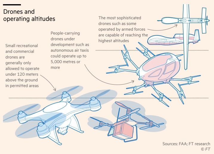 Дроны и рабочие высоты. Небольшим любительским и коммерческим дронам, как правило, разрешено летать только на высоте до 120 метров над землей в разрешенных зонах. Разрабатываемые беспилотные летательные аппараты для перевозки людей, такие как автономные воздушные такси, могут летать на высоте до 5000 метров и более. Самые сложные беспилотники, некоторые из которых эксплуатируются вооруженными силами, способны достигать самых больших высот. Источники: FAA; исследование FT