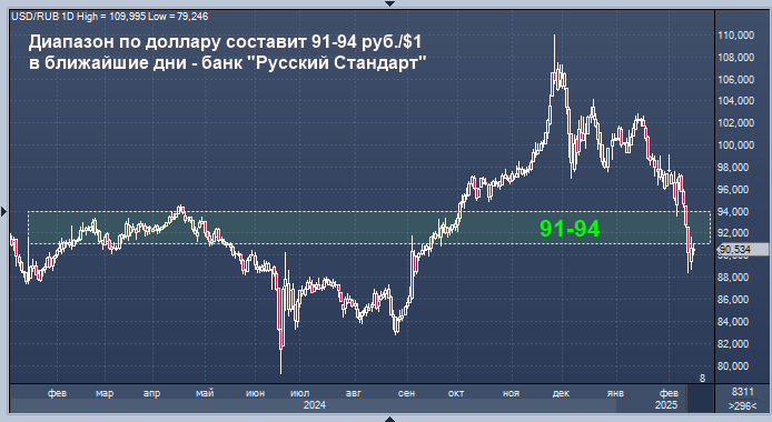 Торговый диапазон по доллару, скорее всего, составит в ближайшие дни 91-94 руб./$1, по евро - 95-98 руб./EUR1, полагает директор департамента операций на финансовых рынках банка "Русский Стандарт" Максим Тимошенко.