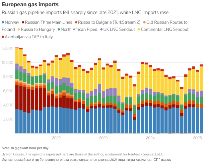 Согласно данным исследовательского центра Bruegel, в 2024 году доля импорта российского газа в Евросоюзе снизилась до 18% по сравнению с 42% в 2021 году. Этот показатель ещё больше уменьшился после того, как в начале года был остановлен последний магистральный трубопровод, соединяющий Россию и Европу через Украину.